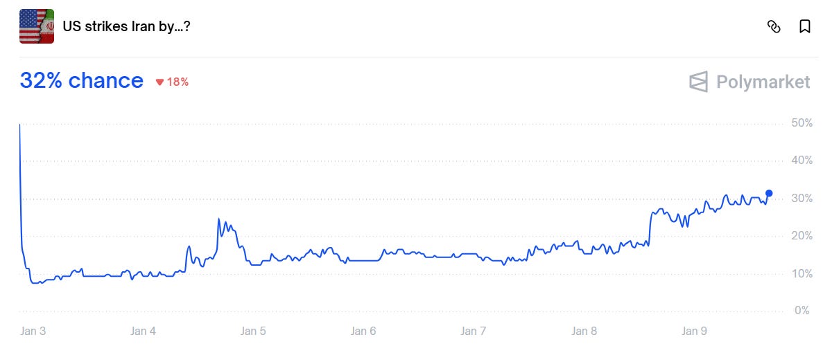 Our precious metals short was in the money for a few days until the Venezuela news came out. Investors are being reminded of Russia/Ukraine in 2022, and have suddenly become fearful of war. Odds of US striking Iran, taking Panama Canal, and acquiring Greenland have suddenly shot up. In times of geopolitical uncertainty, people flock to gold and silver.