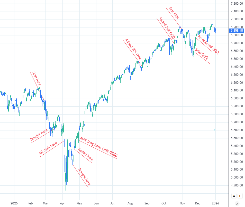 2025 was an great year for us. Our core portfolio returned +23% compared to the S&P500 at 16%. We managed to avoid much of the April Liberation Day selloff, which means we achieved those returns with lower risk than the S&P500. Market timing works!