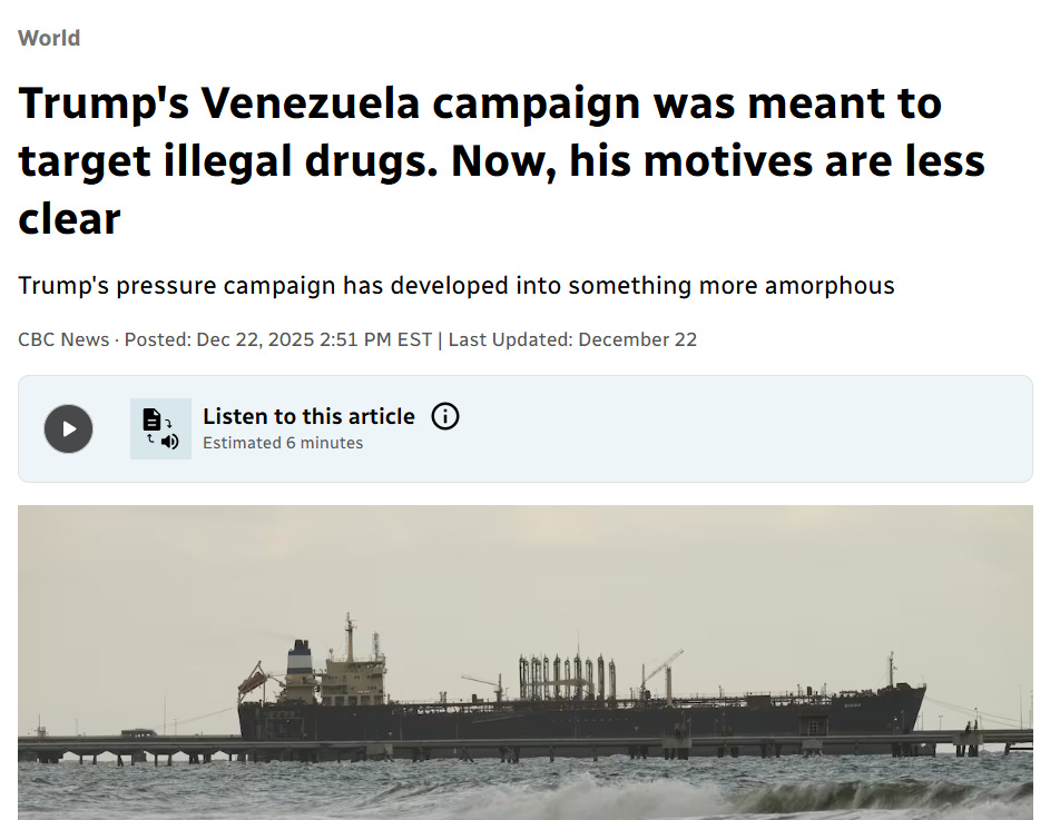 What better way to start an X’mas article than talking about war? The US is tightening pressure on Venezuela by seizing oil tankers that are illegally sending oil to China and Cuba. What started as an interception of drug boats has escalated to choking off 900K barrels per day of oil exports. This was backed by talk of a no-fly zone and more military assets in the Caribbean.